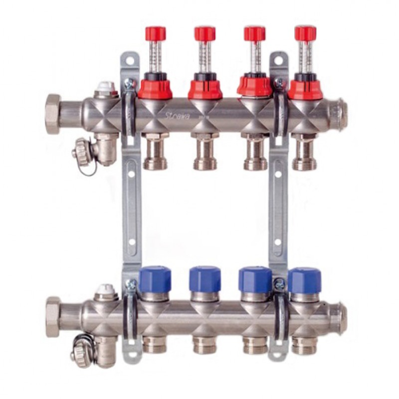 Коллектор теплых полов Strawa e-class 63VA на 4 выхода предназначен для распределения потоков воды для систем теплых полов или радиаторов отопления. Коллектор имеет возможность регулировки потоков расходомерами. Исходный диаметр под евроконус – 3/4".